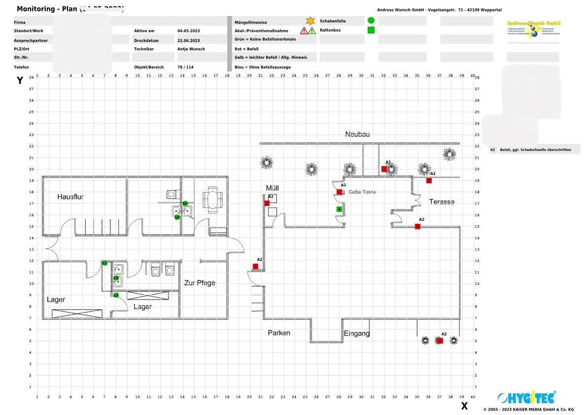 Die Hygitec Dokumentation ist ein datenbankgestütztes Hygiene-Monitoring und Online-Dokumentation Management System. Mithilfe von Barcodescannern werden schädlingsrelevante Daten gesammelt, verarbeitet, ausgewertet und auf Grundrissplänen und Listen dargestellt. Viele weitere Features geben dem PCO-Betrieb, dem Techniker vor Ort, dem Endkunden und dem Auditor die Informationen, die er für die Beurteilung des betreuten Betriebes braucht.